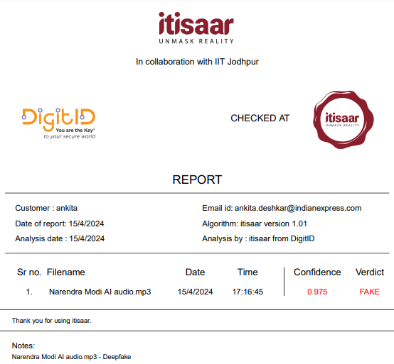 We also uploaded the audio to another AI detector, itisaar.ai, developed by a team at IIT Jodhpur.