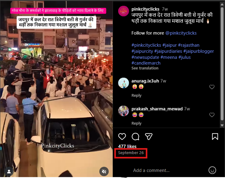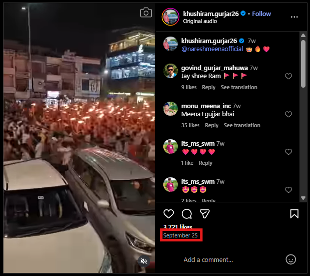 We found another Instagram user, Khushiram Gurjar, who had shared the video and tagged Naresh Meena in the video. The video was uploaded on September 25.