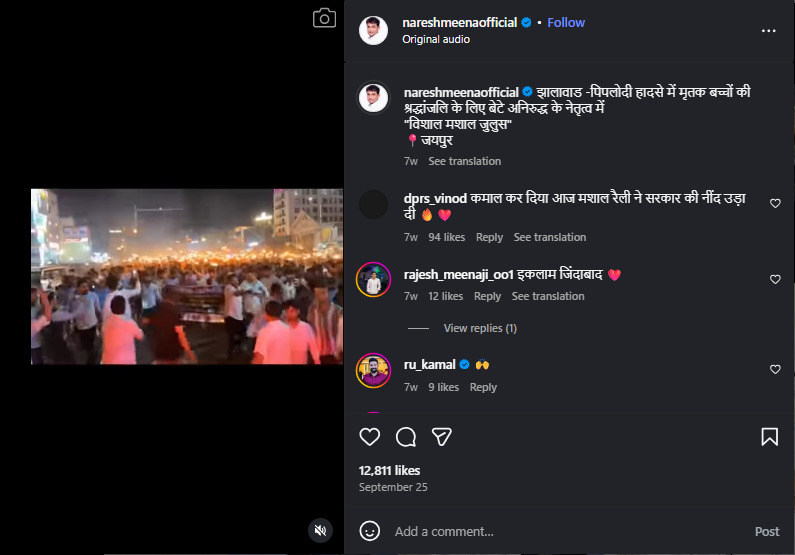 The caption stated: Under the leadership of son Aniruddha to pay tribute to the children who died in the Jhalawad-Piplodi accident, we took out a ‘Huge Torch Procession’. The location mentioned was Jaipur.