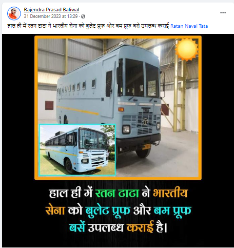 Facebook user Aditya Creator, posted a reel on his profile which stated that Ratan Tata had recently made bullet and bomb proof buses for the Indian Army.