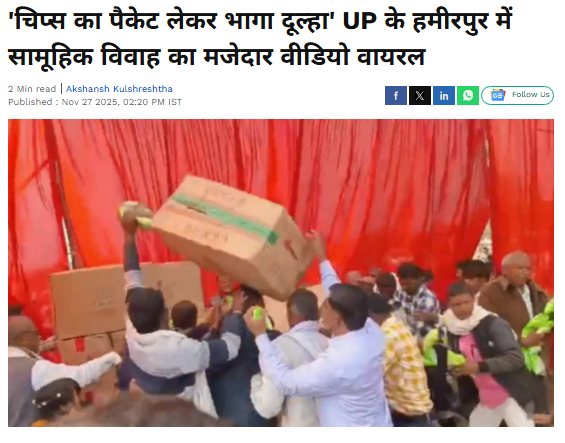 The report said: A Chief Minister Mass Wedding Ceremony was organised in Hamirpur, Uttar Pradesh recently. More than 380 bride-groom pairs from four blocks began a new chapter in their lives through this collective wedding event. Among them were three Muslim couples who accepted nikah. However, moments after the ceremony concluded, chaos broke out at the venue as people rushed in for food and drinks. During this, even a groom was seen running away with a packet of chips. The video of the incident is now going viral on social media.