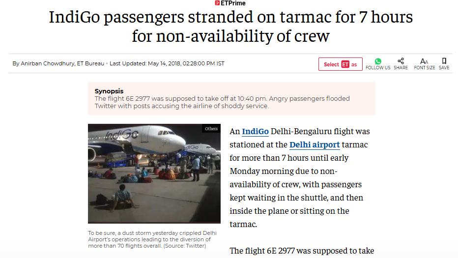 The article was uploaded on 2018. The headline said: IndiGo passengers stranded on tarmac for 7 hours for non-availability of crew