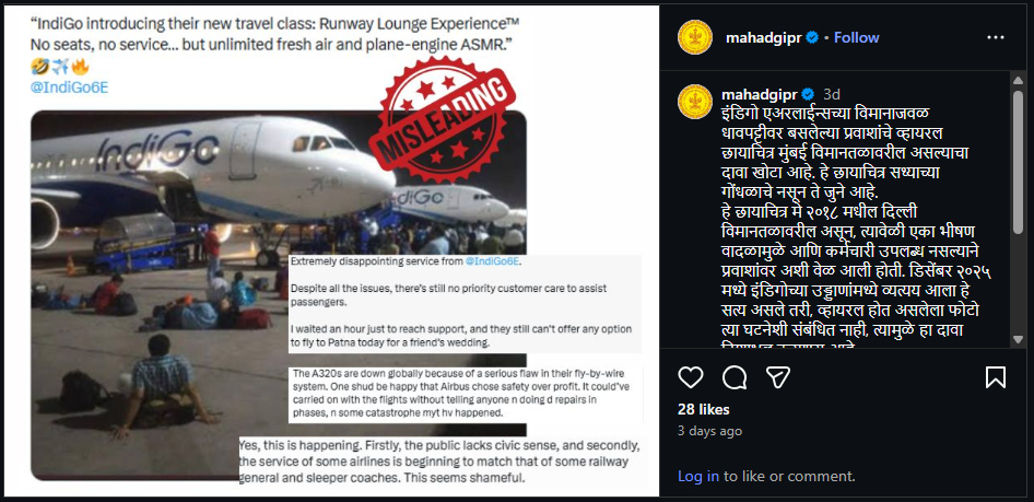 The caption said: The claim that the viral photo of passengers sitting on the runway near Indigo Airlines plane is false. This pic is not of the current chaos but it is old.