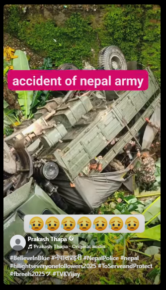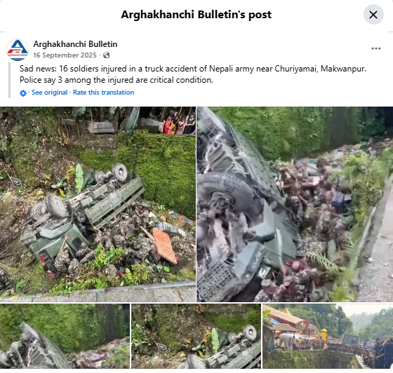The caption of the post said: Sad news: 16 soldiers injured in a truck accident of Nepali army near Churiyamai, Makwanpur. Police say 3 among the injured are in critical condition.