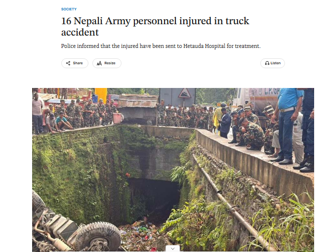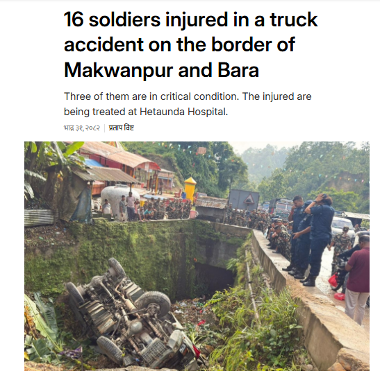 The news reports from 16 September, 2025 mentioned: As many as 16 Nepali Army personnel were hurt after the army’s truck met with an accident in Churiyamai area of Hetauda Sub-metropolitan City-15 on Tuesday. Three of them are in serious condition. The injured are being treated at Hetaunda Hospital.