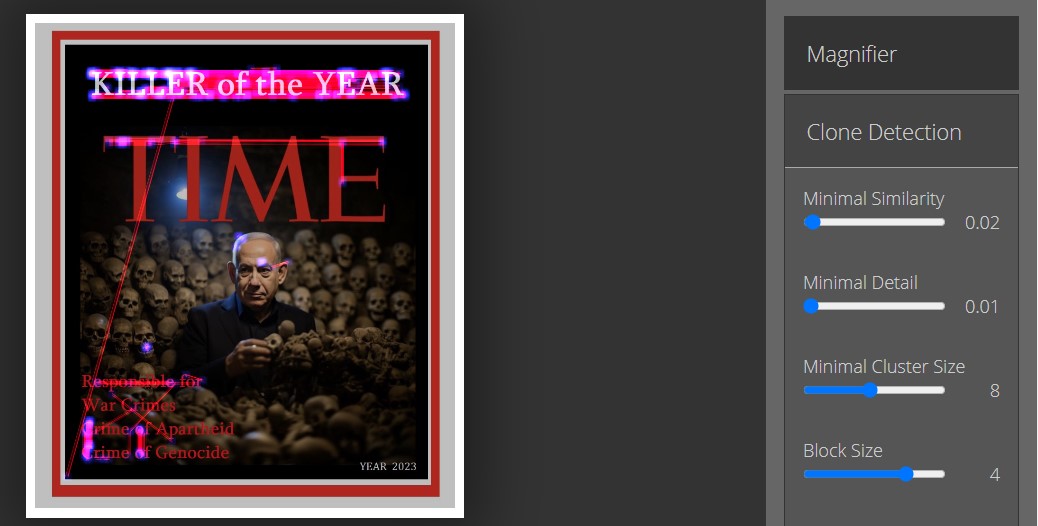 We then ran the image using a tool named, Forensically. Through its ‘clone detection’, Forensically highlights the regions it thinks might have been copied across using the clone tool copy paste option. And we found a few highlights on the image.