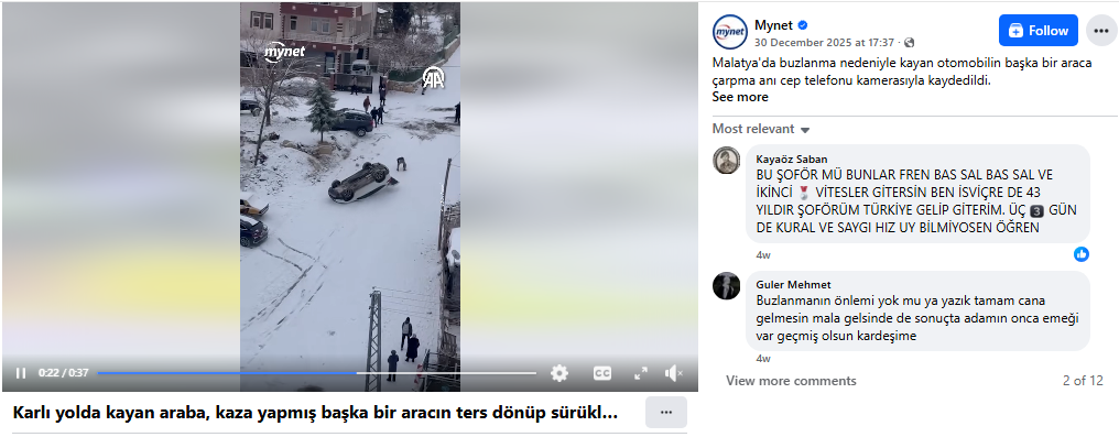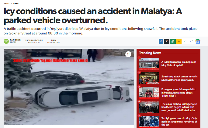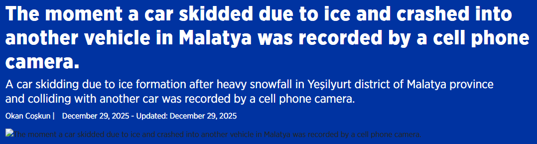 The report was titled (translation): The moment a car skidded due to ice and crashed into another vehicle in Malatya was recorded by a cell phone camera.