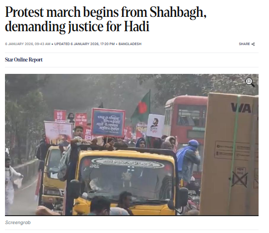 The news reports said: A protest march titled “March for Justice” began from Shahbagh in Dhaka this morning, demanding justice for the killing of Sharif Osman Hadi. The march began around 11:30am from Hadi Chattar in Shahbagh. Leaders said activists of Inqilab Moncho are participating in the march with 10 pickup vans and trucks.