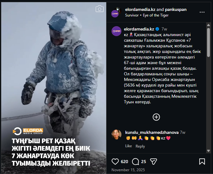 Kazakhstan-based outlet, Elorda Media, shared the same footage on November 15, 2025. The caption said (translation) : Kazakh alpinist and traveler Galymzhan Quspanov has successfully completed the international “Seven Volcanoes” project, becoming the 67th person in the world to climb the highest volcanoes on Earth and the first Kazakh to achieve this feat. He conquered the final peak of the program—the Orizaba volcano (5,636 m) in Mexico—despite challenging weather conditions and strong winds, and raised the State Flag of Kazakhstan at the summit.