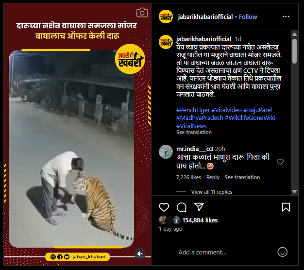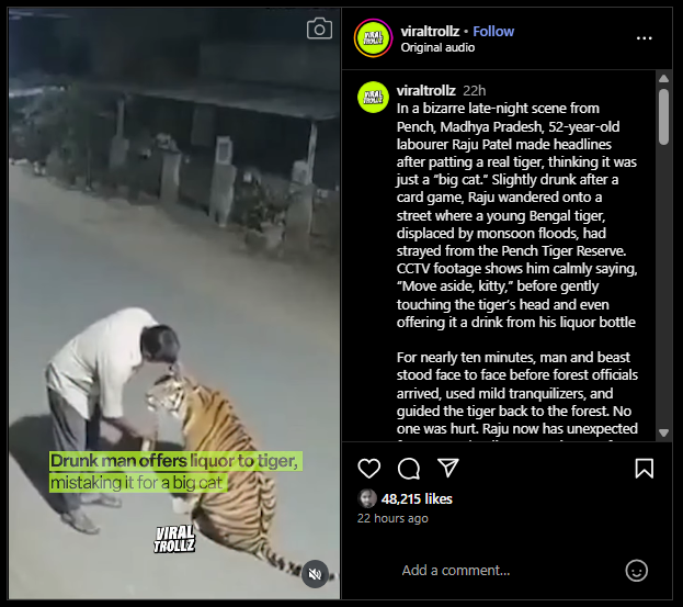 Conclusion: The viral video that shows a drunk man petting and offering alcohol to a tiger in Pench, Madhya Pradesh, is AI-generated. The viral claim is fake.