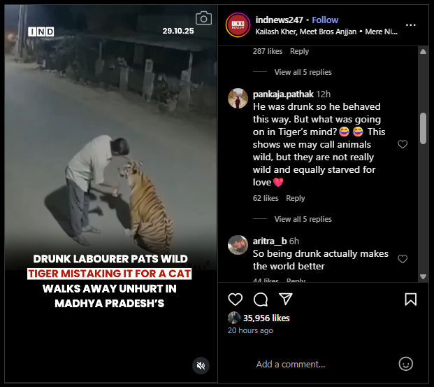 Lighthouse Journalism came across a viral video that featured a man petting a tiger on the streets of India. Many claimed that the video was from Pench, a national park known for its tiger population in Madhya Pradesh, and several posts also claimed that the drunk man offered the tiger some alcohol.
