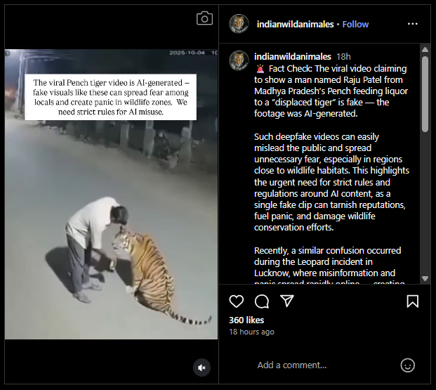 उन्होंने यह भी स्पष्ट किया कि किसी बाघ के साथ ऐसी स्थिति पैदा नहीं हो सकती, जब तक कि वह बाघ पालतू न हो। इससे यह स्पष्ट होता है कि वीडियो पूरी तरह से गलत हो सकता है और इसे एआई के जरिए भी जेनरेट किया जा सकता है।