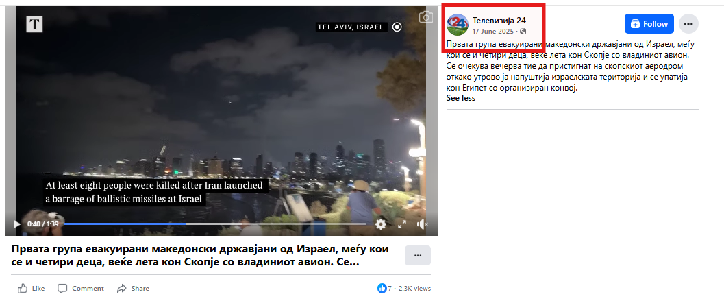 The caption said: The first group of evacuated Macedonian citizens from Israel, including four children, is already flying to Skopje on the government aircraft. They are expected to arrive at the Skopje airport this evening after leaving Israeli territory this morning and heading to Egypt in an organized convoy.